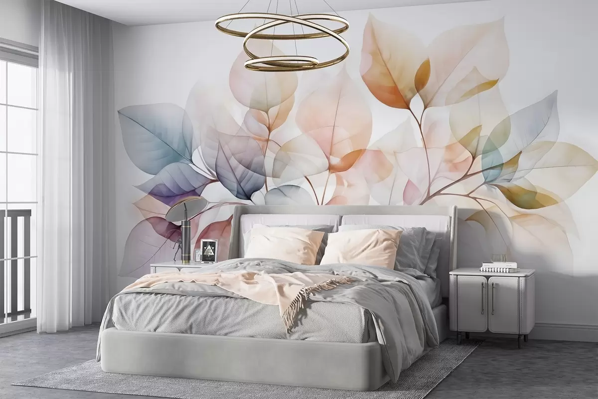 Fototapetai Akvarele tapytas permatomų lapų paveikslas pastelinėmis spalvomis su rožinės, baltos, violetinės ir mėlynos spalvos atspalviais Nr. w08910