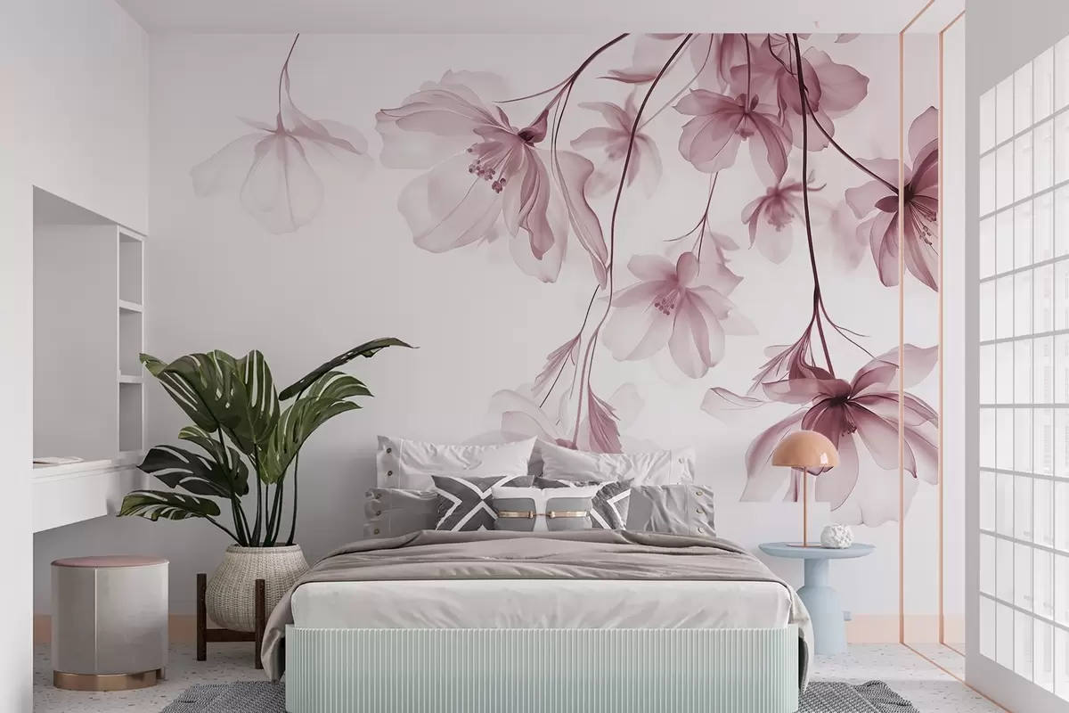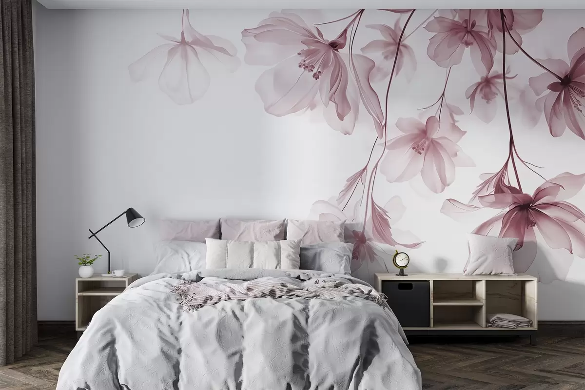 Fototapetai Rožinės gėlės su permatomais žiedlapiais, kabančios ant šakos, rožinė ir balta spalvos, minimalistinė modernaus meno kompozicija Nr. w08911v2