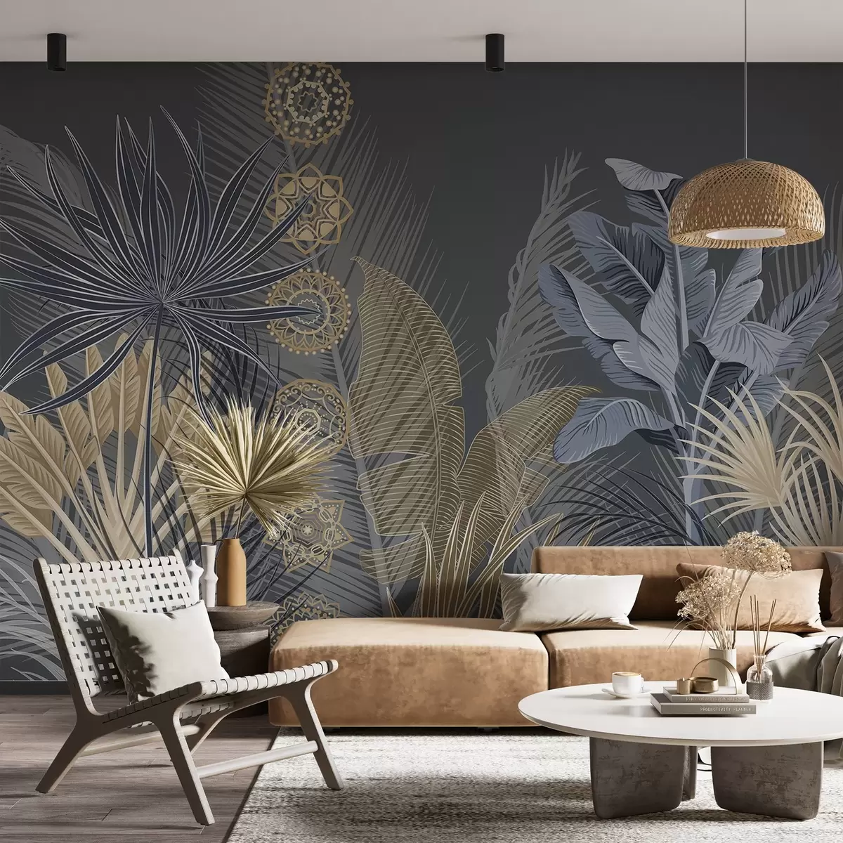 Fototapetai Atogrąžų lapai, mėlyni ir rudi tonai, palmių lapai, bananų lapai ir mandalos ornamentai, tamsus fonas Nr. w08913