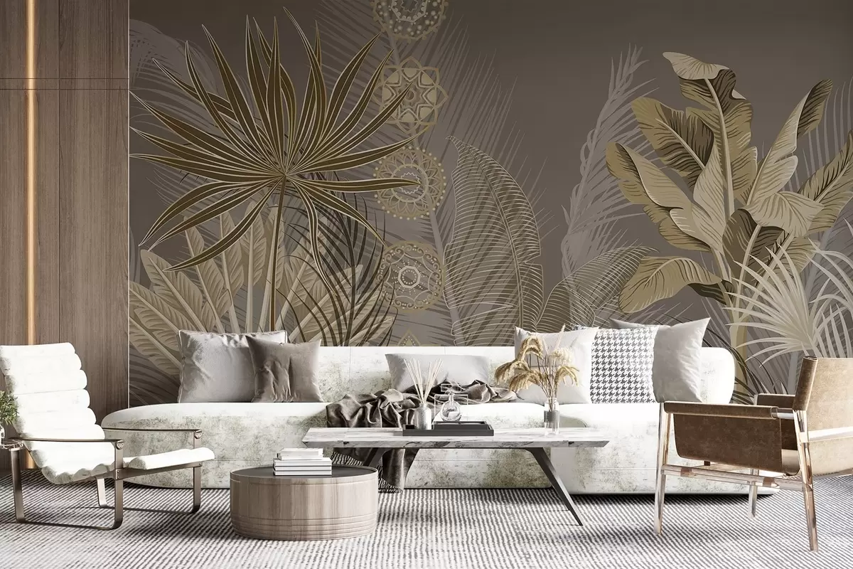 Fototapetai Atogrąžų lapai smėlio ir rudos spalvos, palmių lapai, bananų lapai ir mandalos ornamentai, tamsus fonas Nr. w08913v1