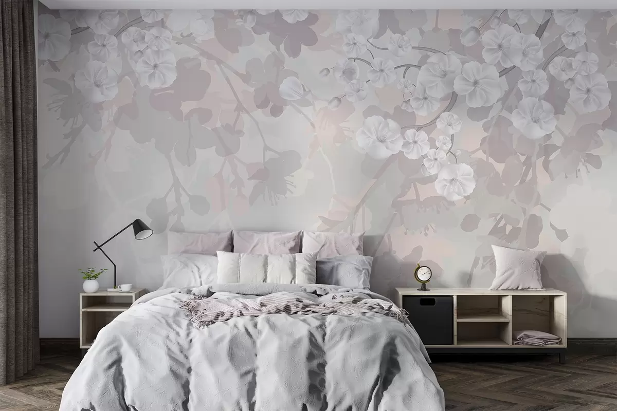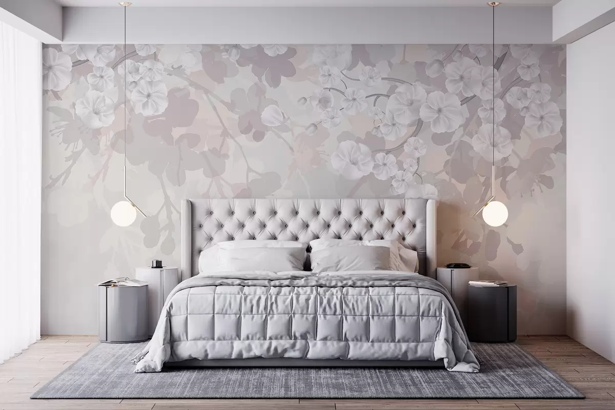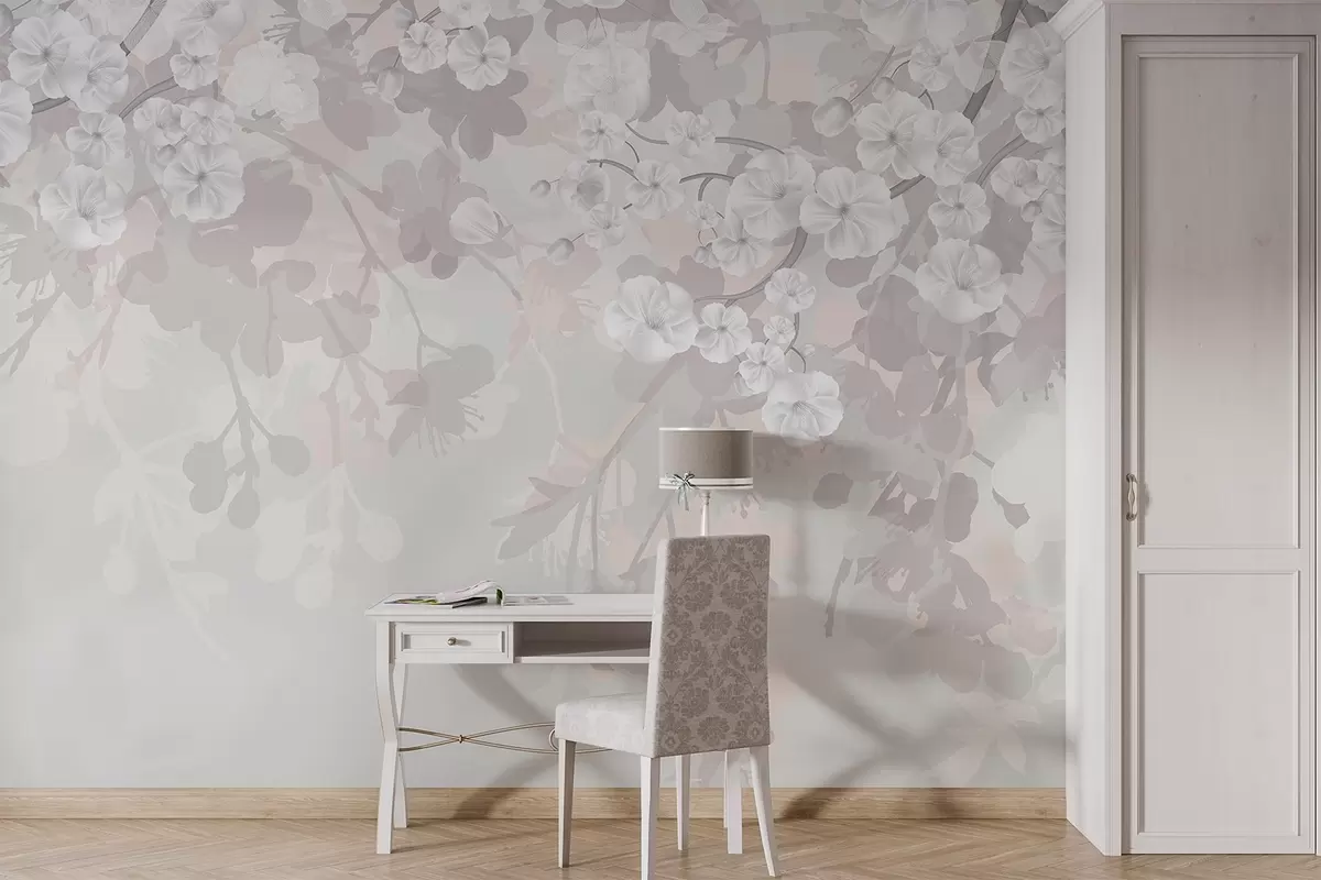 Fototapetai Vyšnių žiedų šakos su baltais žiedais ir pilkais lapais ant elegantiškų gėlių siluetų švelniomis pastelinėmis spalvomis Nr. w08973v1