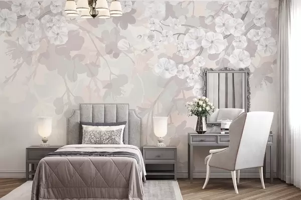 Fototapetai Vyšnių žiedų šakos su baltais žiedais ir pilkais lapais ant elegantiškų gėlių siluetų švelniomis pastelinėmis spalvomis Nr. w08973v1