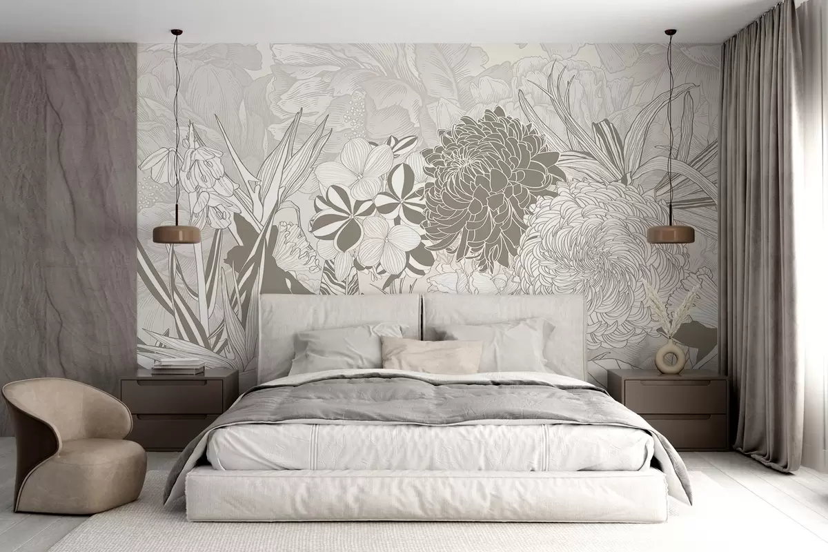 Fototapetai Smėlio spalvos gėlės ir lapai, įskaitant chrizantemas, plumerijas ir atogrąžų lapus, botaninis dizainas Nr. w08976