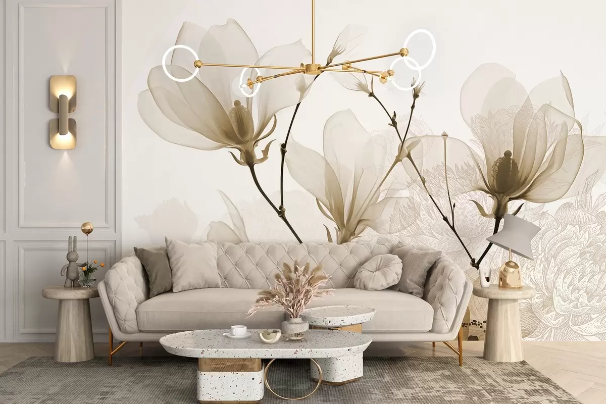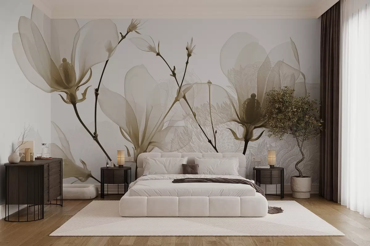 Fototapetai Permatomos smėlio spalvos magnolijos žiedai su gėlių siluetais su švelniais žiedlapiais ir tamsiais stiebais Nr. w08978v1