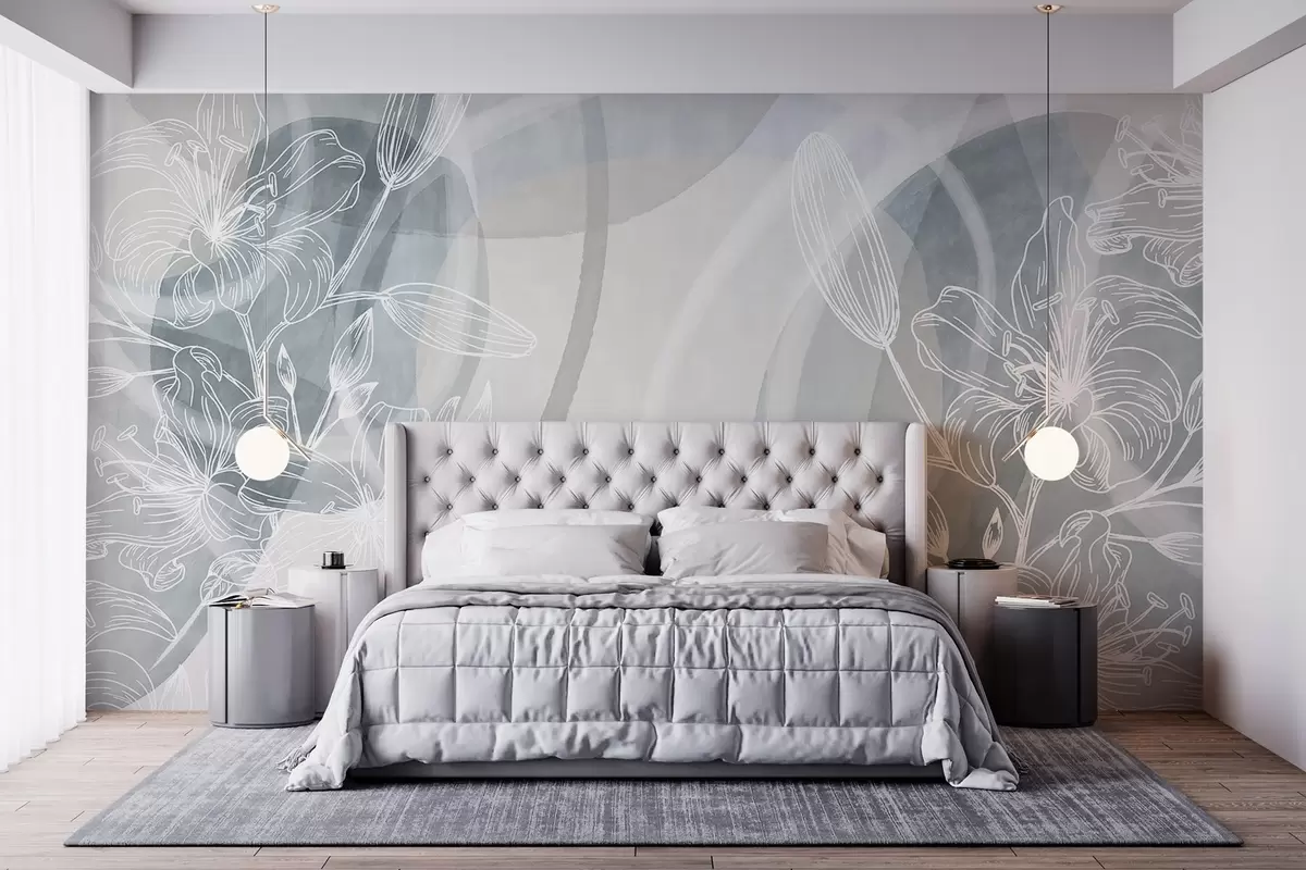 Fototapetai Minimalistinis gėlių dizainas su baltomis linijų meno gėlėmis ir lapais, persidengiančiais abstrakčiais pilkų ir mėlynų atspalvių apskritimais Nr. w08979