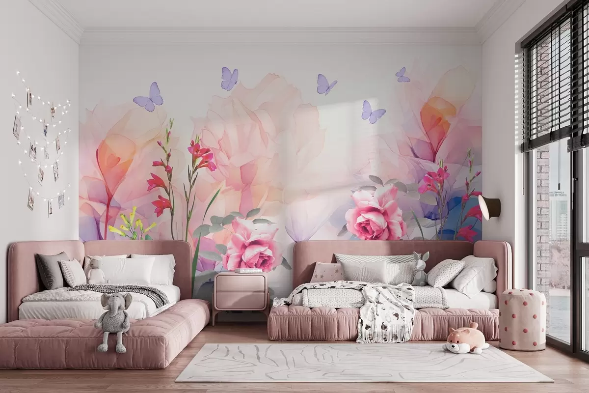 Fototapetai Akvarelės stiliaus gėlės su drugeliais ir rožėmis Nr. w09002