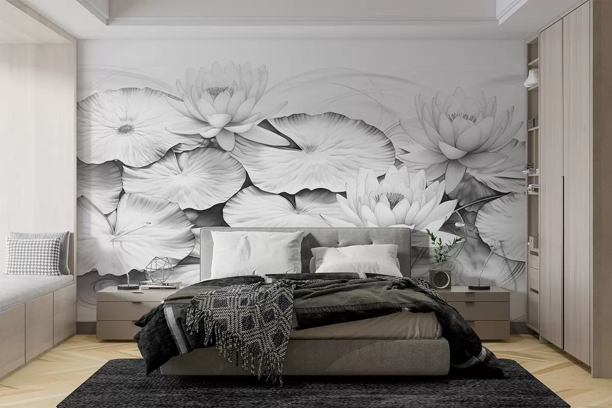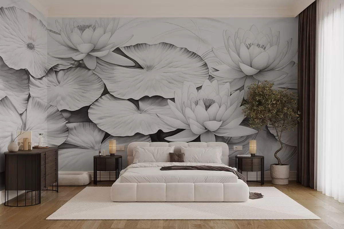 Fototapetai Vandens lelijos ir lelijų pagalvėlės tvenkinyje, juodai balta piešinio pieštuku imitacija, detali botaninė iliustracija, gamtos menas Nr. w09006