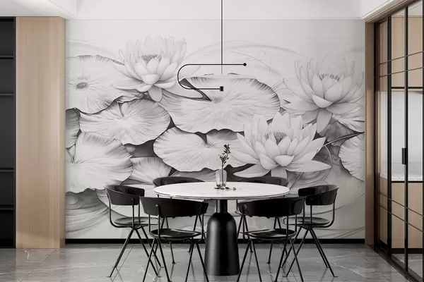 Fototapetai Vandens lelijos ir lelijų pagalvėlės tvenkinyje, juodai balta piešinio pieštuku imitacija, detali botaninė iliustracija, gamtos menas Nr. w09006