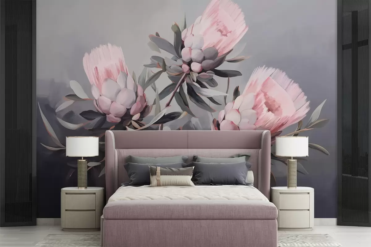 Fototapetai Rožinės protea abstrakčios gėlės su pilkais lapais, minkšta tekstūra, prislopintos spalvos, neryškiame pilkame fone Nr. w09014
