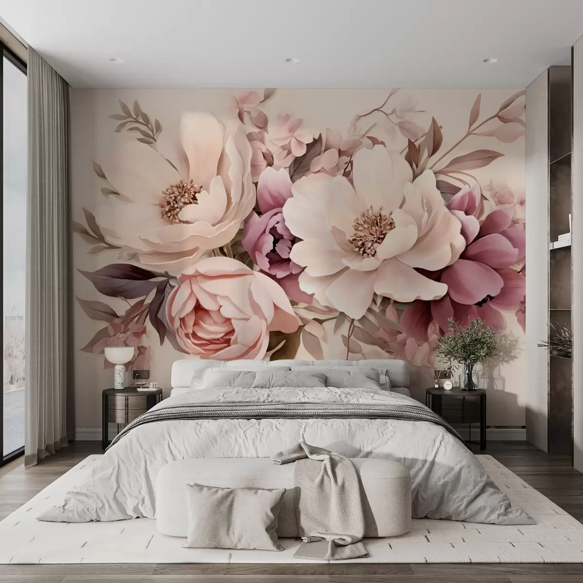 Fototapetai Švelni rausvų ir smėlio spalvos gėlių, bijūnų su lapais kompozicija Nr. w09019