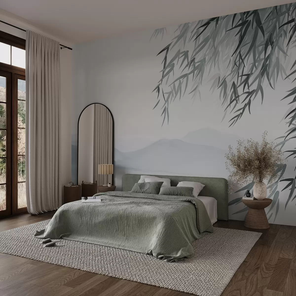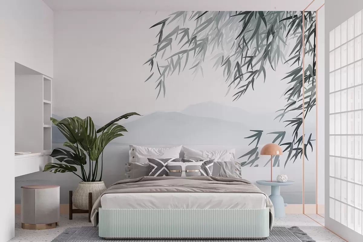 Fototapetai Bambuko lapai, kabantys virš ežero su kalnais fone, švelnūs mėlyni ir balti tonai, rašalo plovimo tapybos stilius w09048