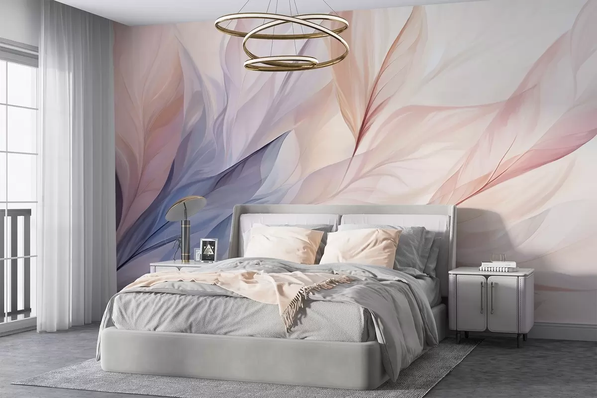 Fototapetai Abstraktus gėlių dizainas, kurio pastelinių rausvų, persikinių ir mėlynų atspalvių žiedlapiai sudaro švelnią ir svajingą kompoziciją Nr. w09049