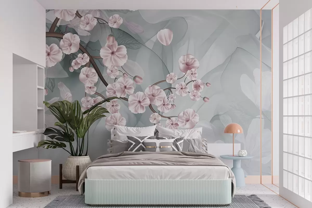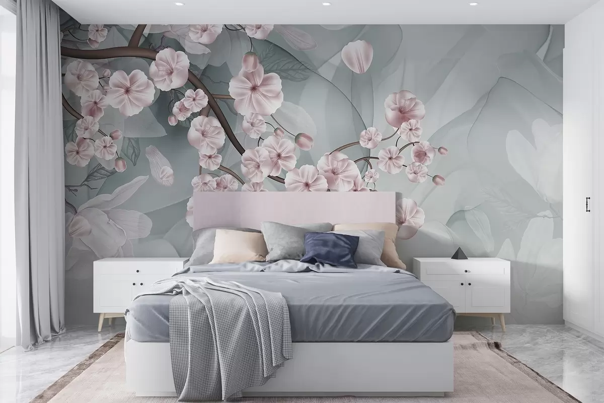 Fototapetai Vyšnių žiedų šakos su rausvais žiedais ir žiedlapiais, rudos šakos, abstraktus prislopintas fonas su tekėjimo efektu Nr. w09054