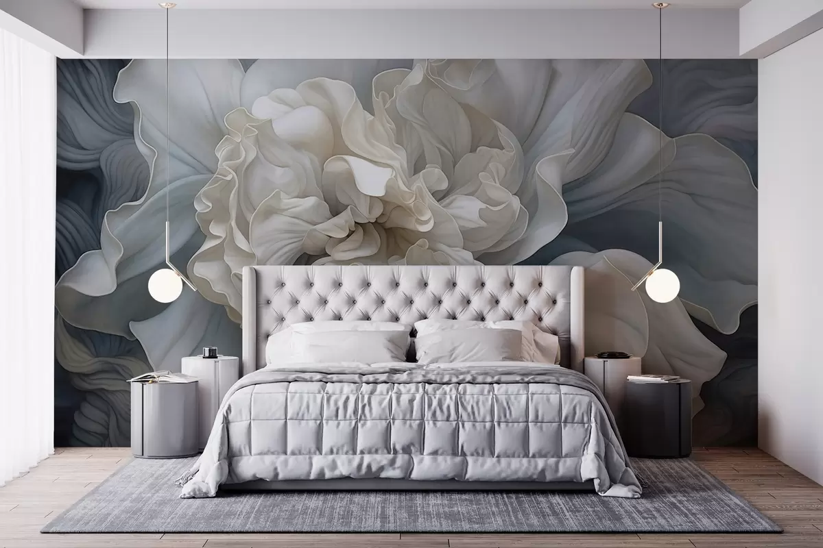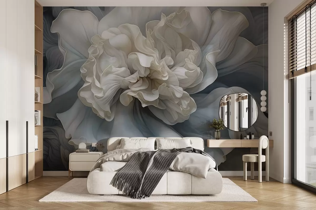 Fototapetai Abstrakti didelė dekoratyvinė gėlė su daugybe žiedlapių, švelni ir subtili, fone mėlyni ir pilki atspalviai Nr. w09055