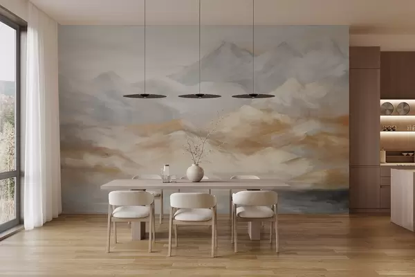 Fototapetai Tekstūrinis baltos, pilkos ir rudos spalvos kalnų su ežeru pirmame plane paveikslas Nr. w09057