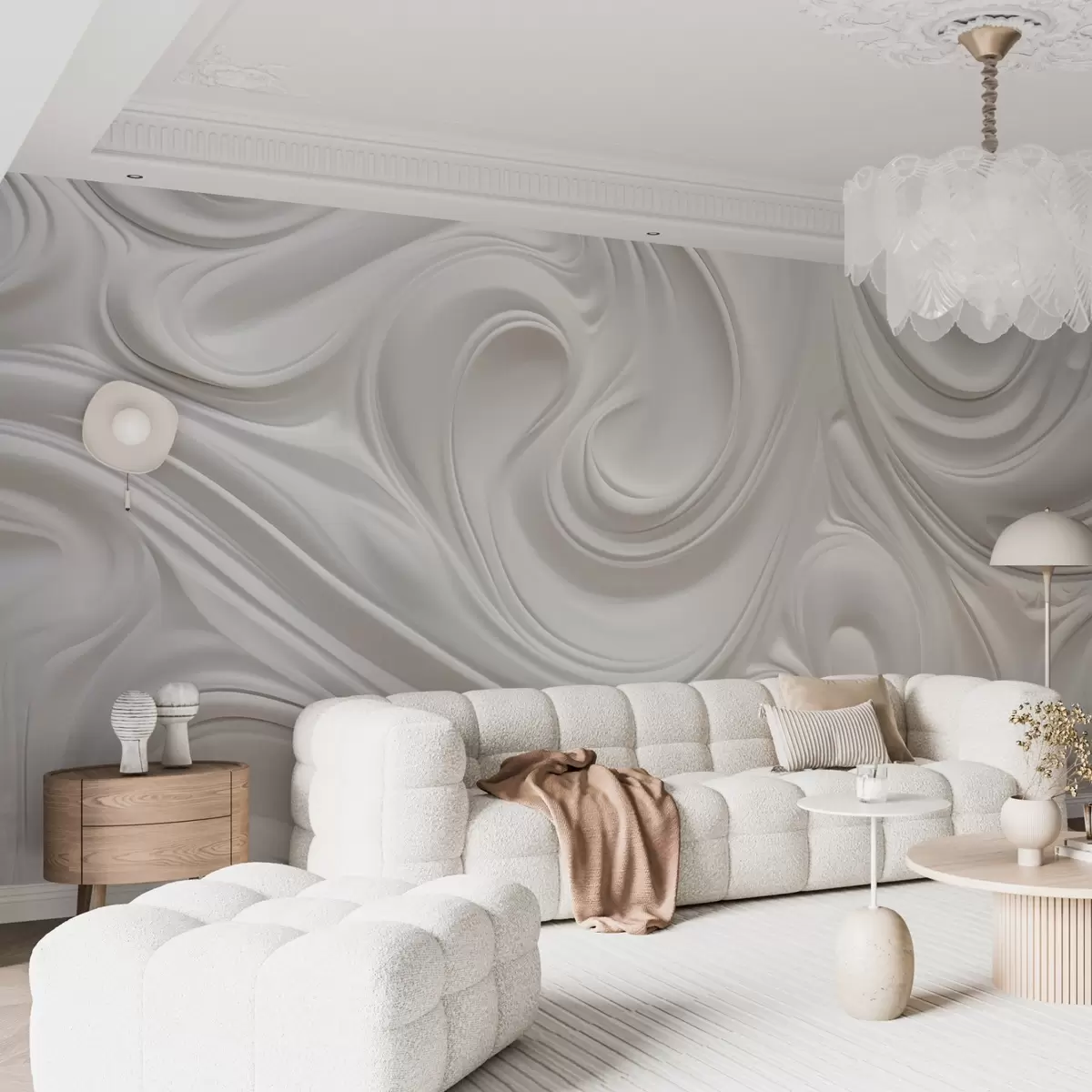 Fototapetai Baltas abstraktus šiuolaikinis menas su sklandžiais sūkuriais ir bangomis, lygi tekstūra, elegantiškas dizainas, minimalistinė estetika Nr. w09059