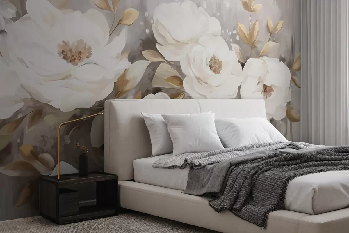 Fototapetai Baltos gėlės su geltonais lapais, minkšti žiedlapiai, subtili gėlių kompozicija, neutrali spalvų paletė, tekstūriniai potėpiai Nr. w09062