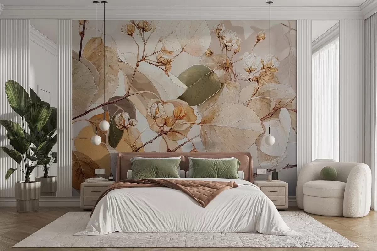 Fototapetai Drebulės lapų ir gėlių šakos aliejinės tapybos stiliumi smėlio spalvos atspalviais Nr. w09082