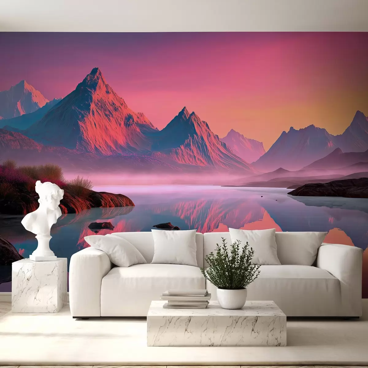 Fototapetai Romantiškas saulėlydžio kraštovaizdis su rožiniais atspalviais nuspalvinta upe ir kalnais Nr. w09093