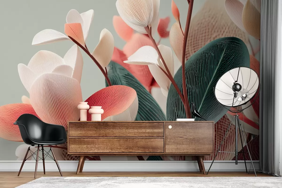 Fototapetai Pastelinių ir žalių atspalvių tekstūruotos gėlės ir lapai Nr. w09094