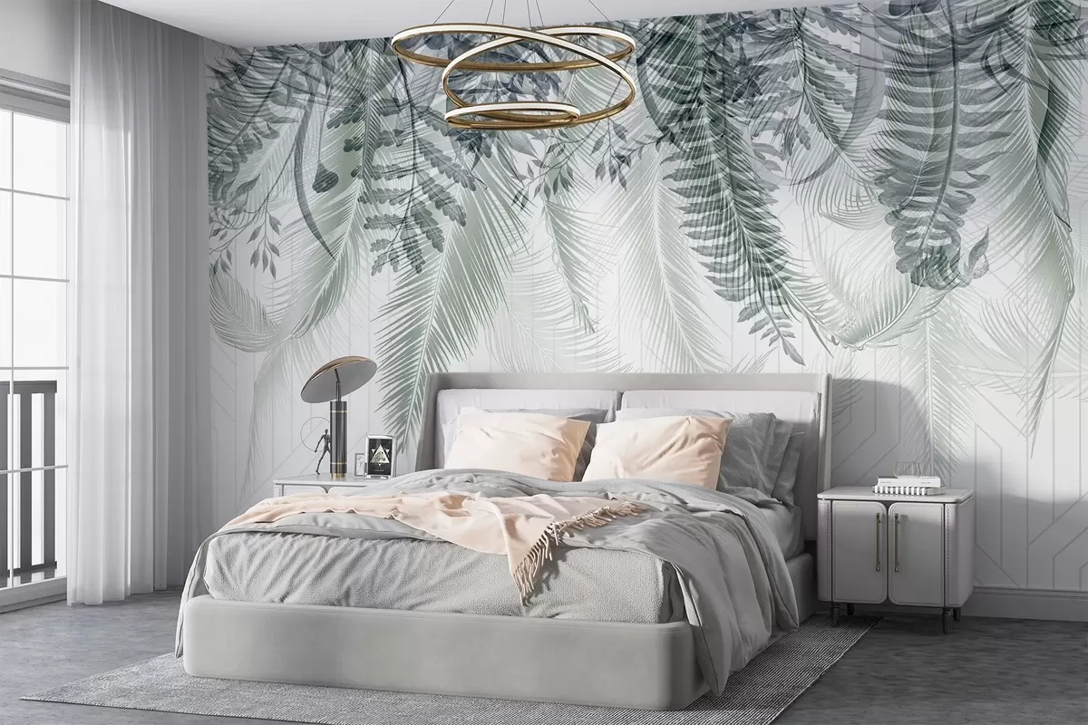 Fototapetai Subtilus krintančių tropinių paparčių ir palmių lapų, geometrinis fonas, minkšta šviesa, prislopintos spalvos, elegantiškas Nr. w09106