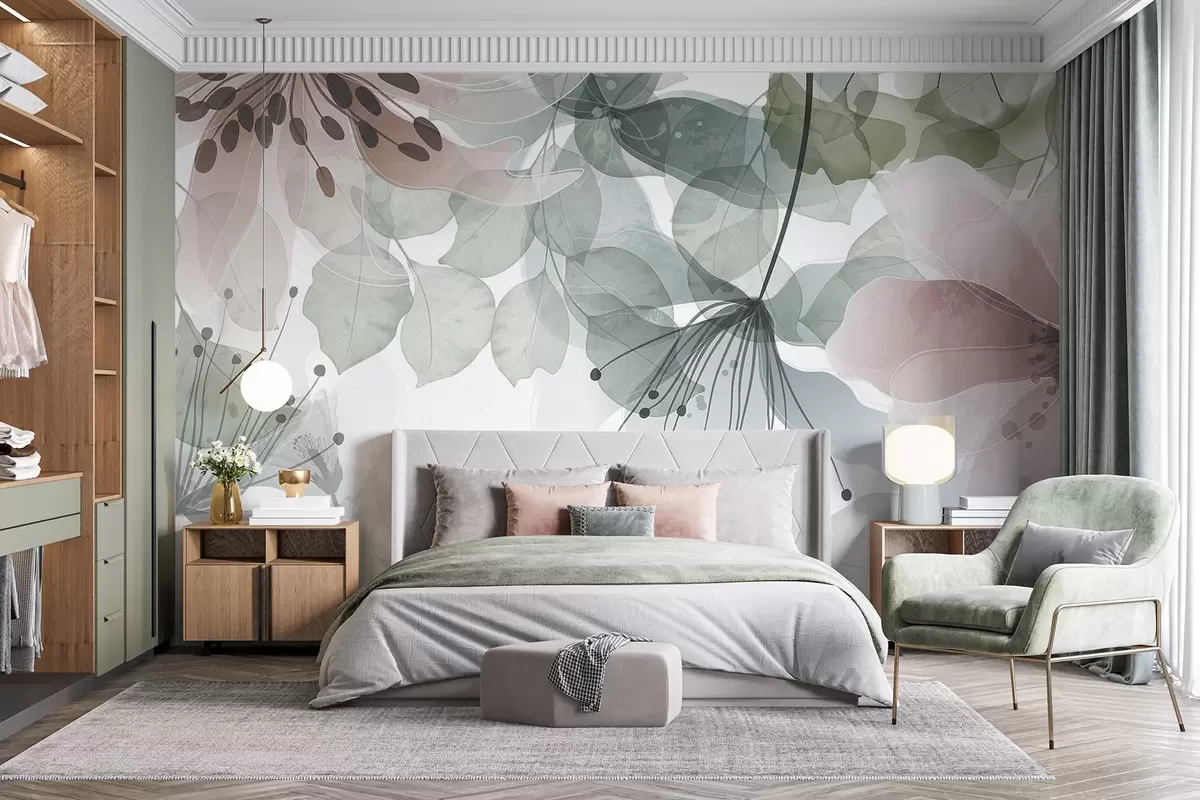 Fototapetai Pastelinių spalvų gėlės ir lapai, permatomi žiedlapiai ir lapai, švelnus akvarelės efektas, subtilios linijos, baltas fonas Nr. w09107