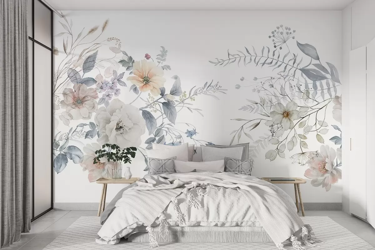 Fototapetai Akvarelinės tapybos stiliaus gėlių kompozicija su baltomis, persikų ir mėlynomis gėlėmis, švelnia žaluma baltame fone Nr. w09108
