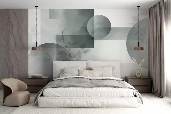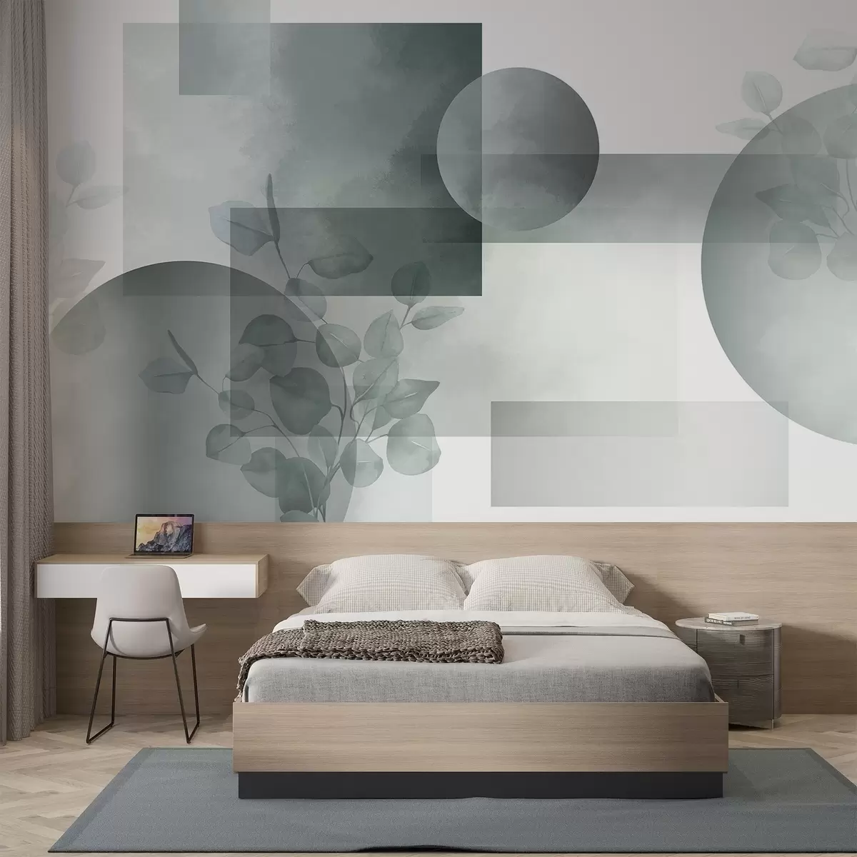 Fototapetai Abstraktus modernus minimalistinis geometrinis dizainas su apskritimais ir stačiakampiais, eukalipto lapai, akvarelės efektas Nr. w09110