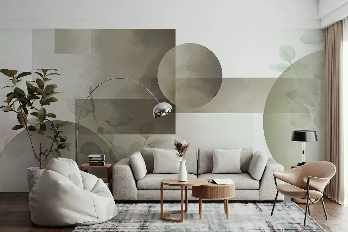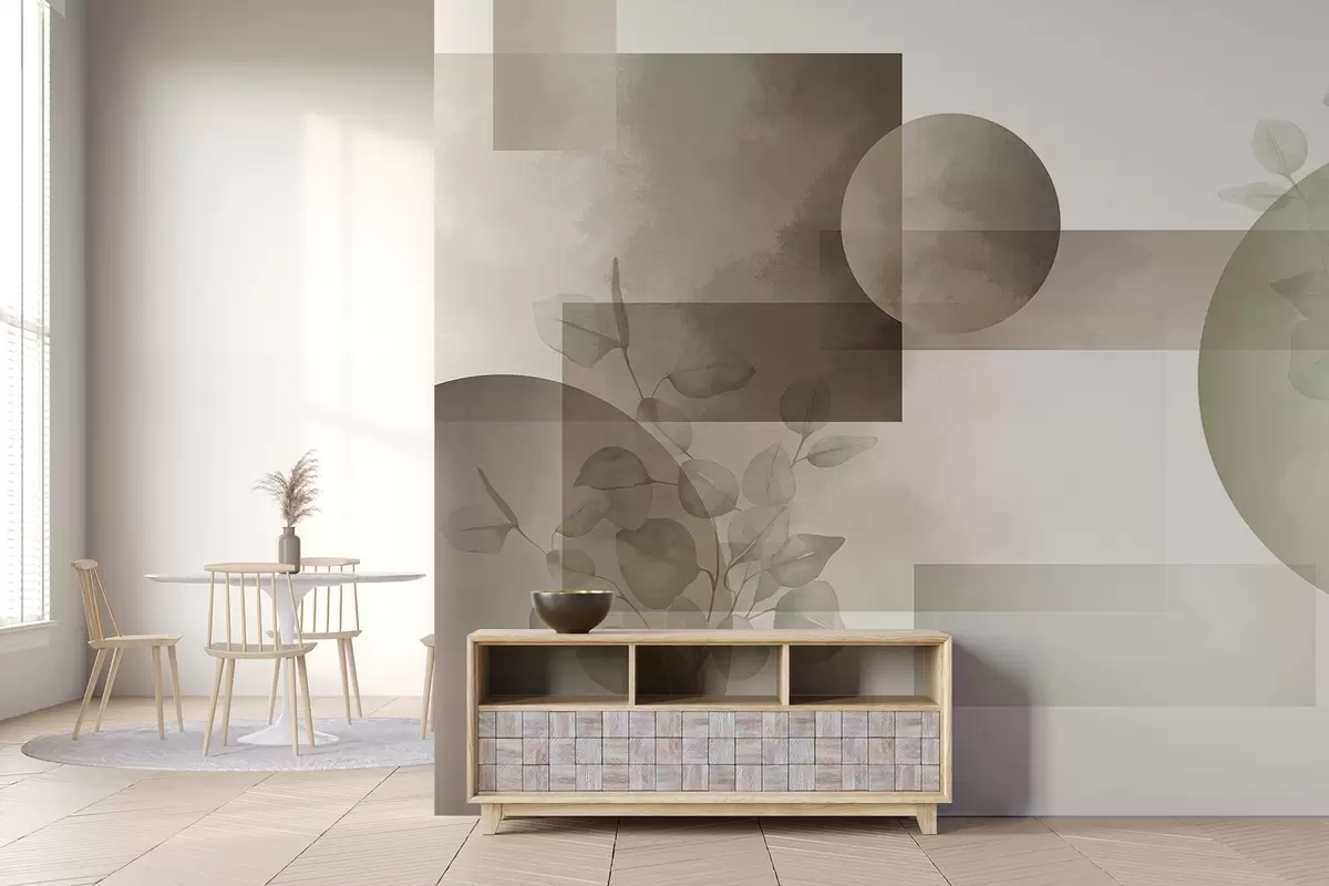 Fototapetai Abstraktus modernus minimalistinis geometrinis dizainas su apskritimais ir stačiakampiais, eukalipto lapai, akvarelės efektas Nr. w09110v1