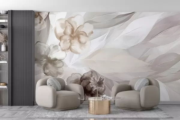 Fototapetai Švelnios gėlės ir lapai baltos, rudos ir smėlio spalvos gėlių fone , švelnios spalvos, subtilūs žiedlapiai Nr. w09111v1