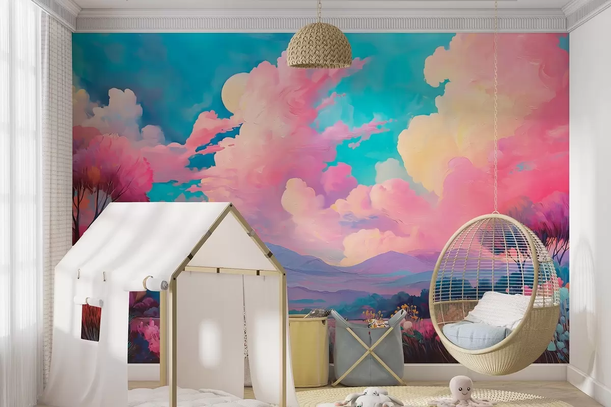 Fototapetai Spalvingas aliejinės tapybos stiliaus peizažas su rausvu dangumi, augalais ir medžiais Nr. w09123