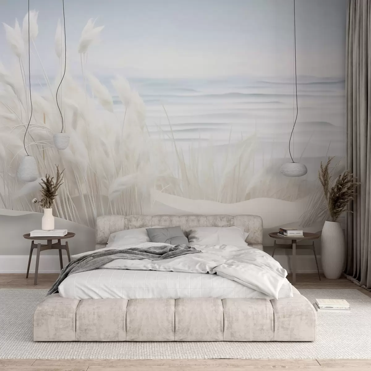 Fototapetai Peizažas su balta pampų žole ant smėlio kopos, o fone - šviesiai mėlynas vandenynas, švelnus, minimalistinis stilius Nr. w09132
