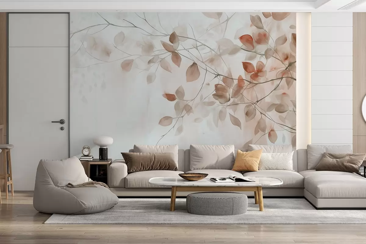 Fototapetai Tekstūrinė akvarelės tapyba, imituojanti rudus lapus ir šakas, švelnios spalvos, subtilios detalės baltame fone Nr. w09133