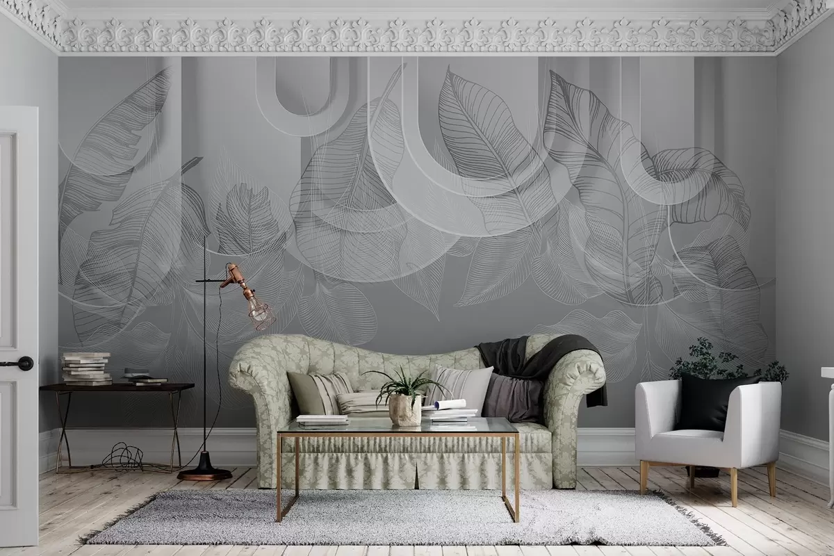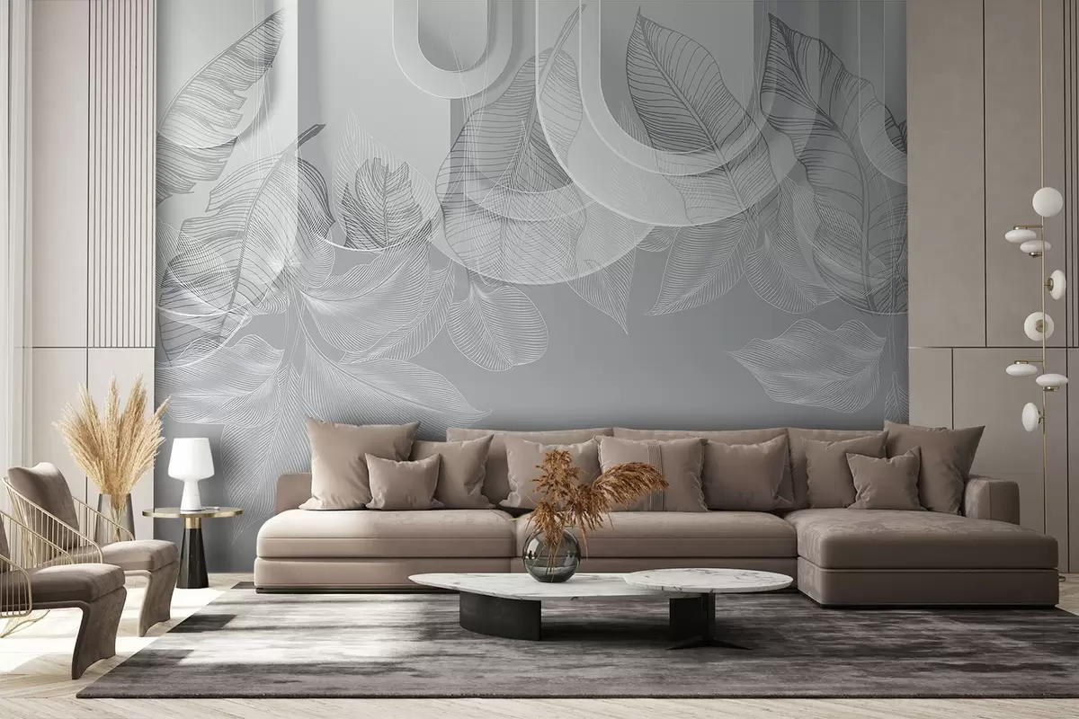 Fototapetai Abstraktus fonas su pilkomis arkomis ir baltais atogrąžų lapais, minimalistinis dizainas, elegantiškas ir modernus, neutrali spalvų paletė Nr. w09138
