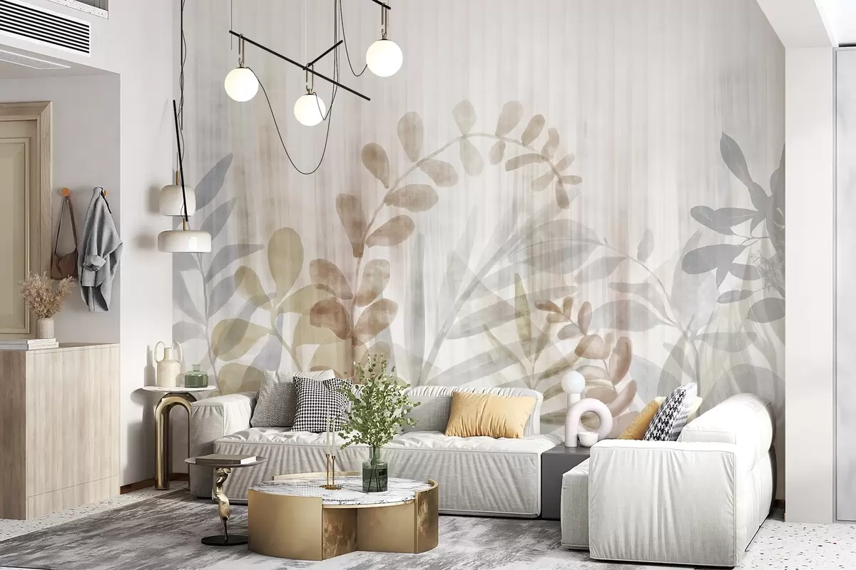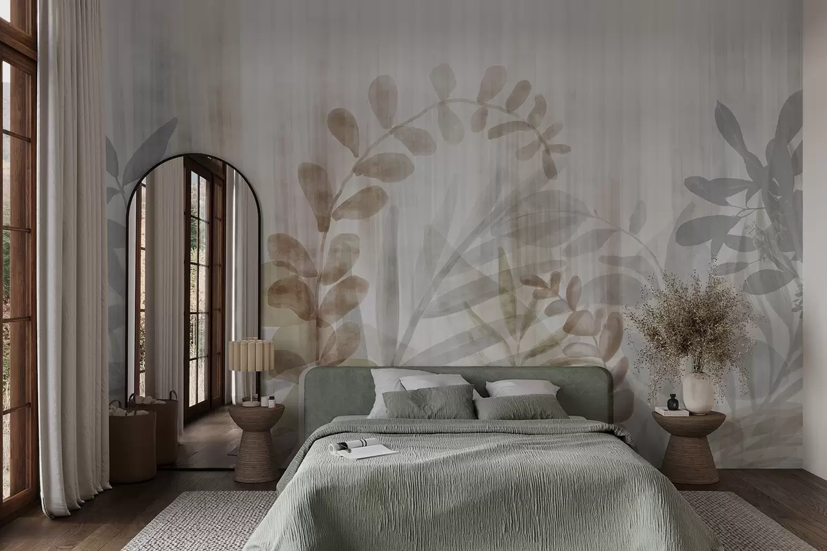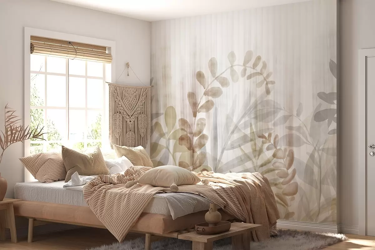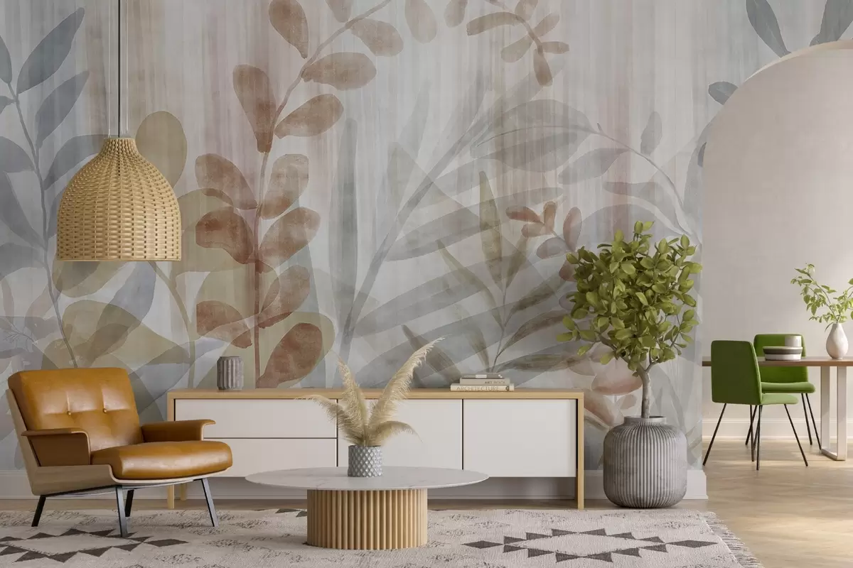 Fototapetai Akvarelinis paveikslas, imituojantis augalus su įvairiaspalviais prislopintais lapais, šviesus fonas su vertikaliomis linijomis, botaninė iliustracija Nr. w09146