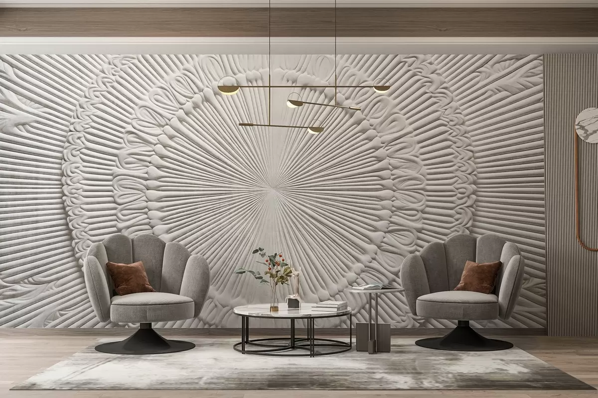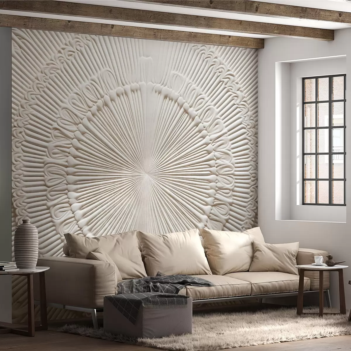 Fototapetai Abstraktus tekstūrinis apskritimo formos raštas su radialinėmis linijomis ir dekoratyviniais elementais, simetriškas dizainas, reljefinė tekstūra Nr. w09154