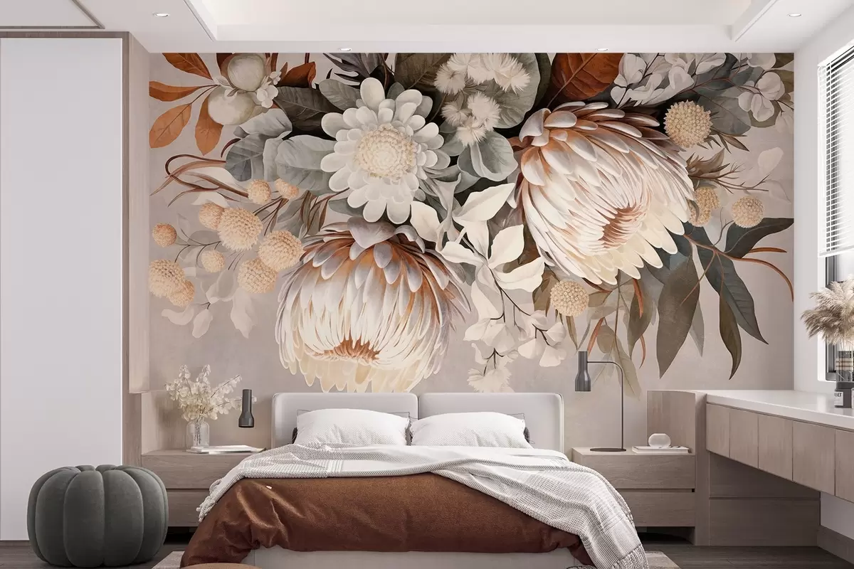 Fototapetai Didelė tekstūruota protea su rudais akcentais, baltais margučiais ir geltonais žiedais, smėlio spalvos prislopintas fonas Nr. w09157