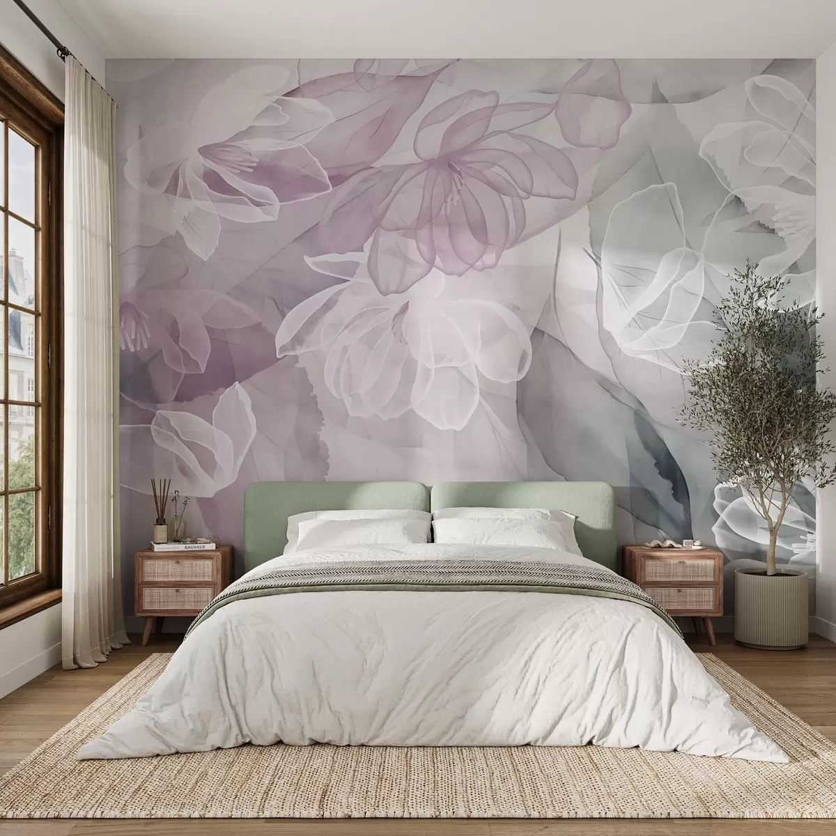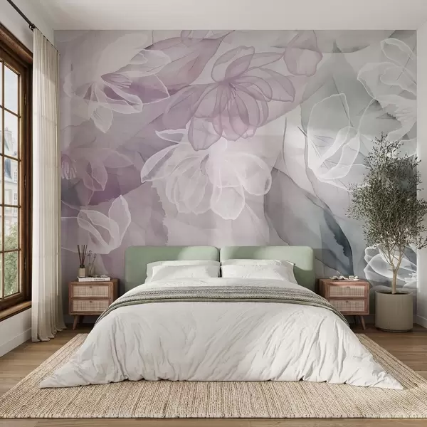 Fototapetai Žiedai ir lapai su skaidriais baltų, rausvų ir žalių atspalvių žiedlapiais, švelnūs ir subtilūs Nr. w09158v1