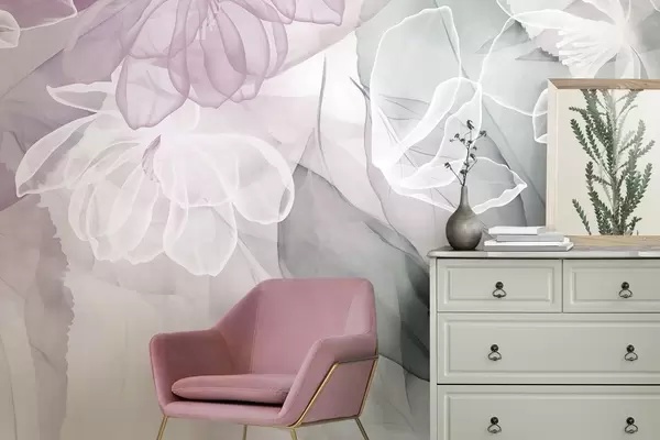 Fototapetai Žiedai ir lapai su skaidriais baltų, rausvų ir žalių atspalvių žiedlapiais, švelnūs ir subtilūs Nr. w09158v1