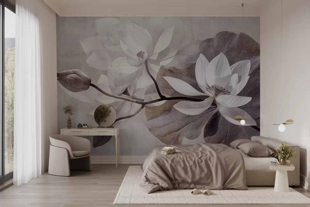 Fototapetai Grūdėtos tekstūros prislopintos subtilios lotoso gėlės su lapais ir stiebais, švelnios smėlio spalvos paletė Nr. w09159