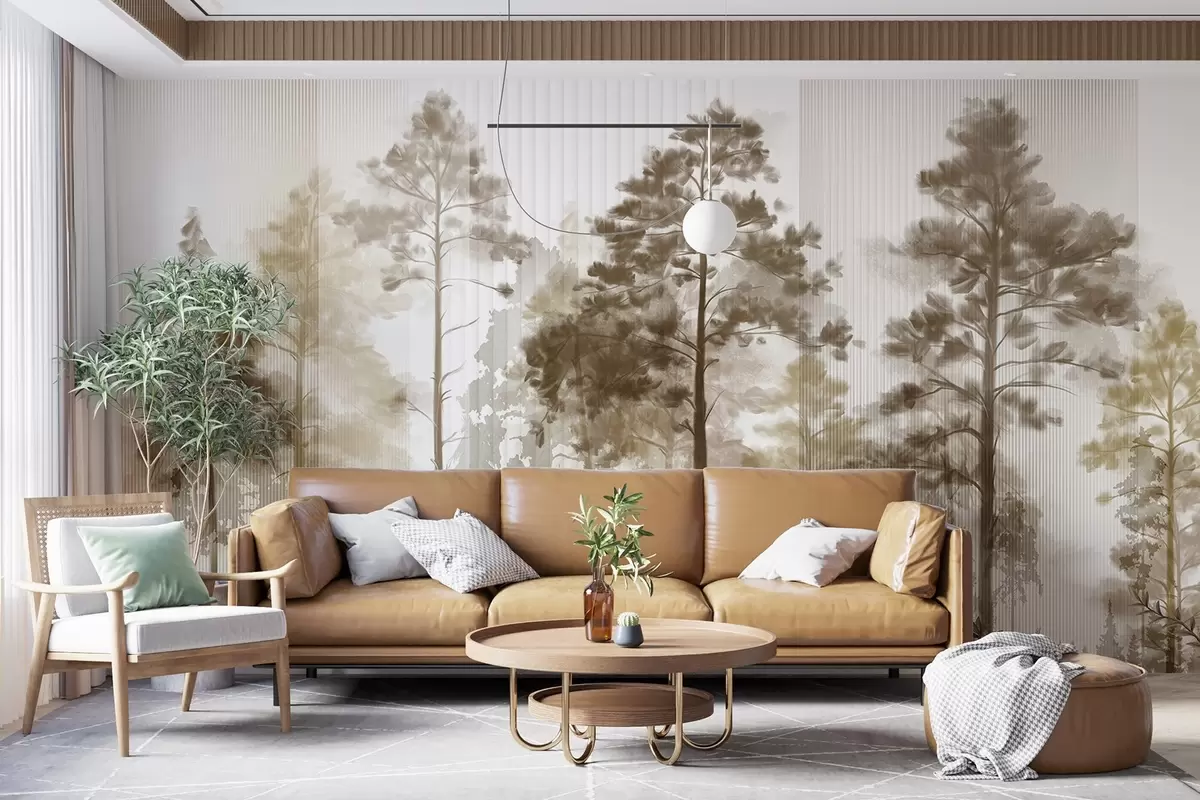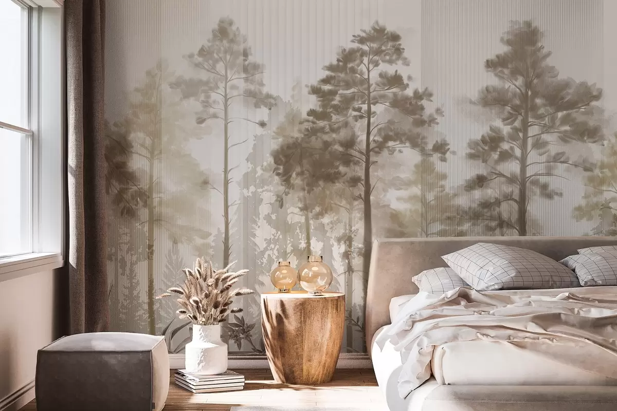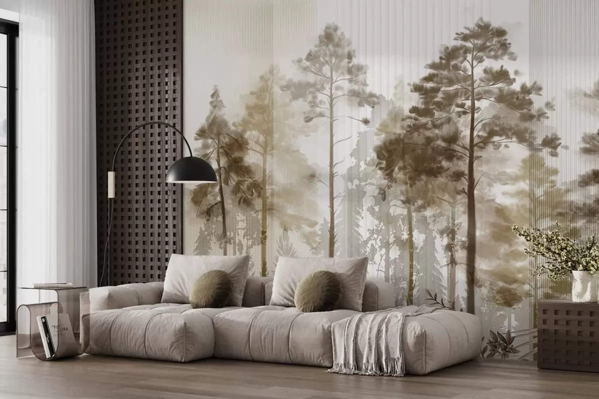 Fototapetai Tankus miškas su aukštomis pušimis, vešlia smėlio spalvos lapija, miglota atmosfera ir vertikalių linijų tekstūra Nr. w09163v1