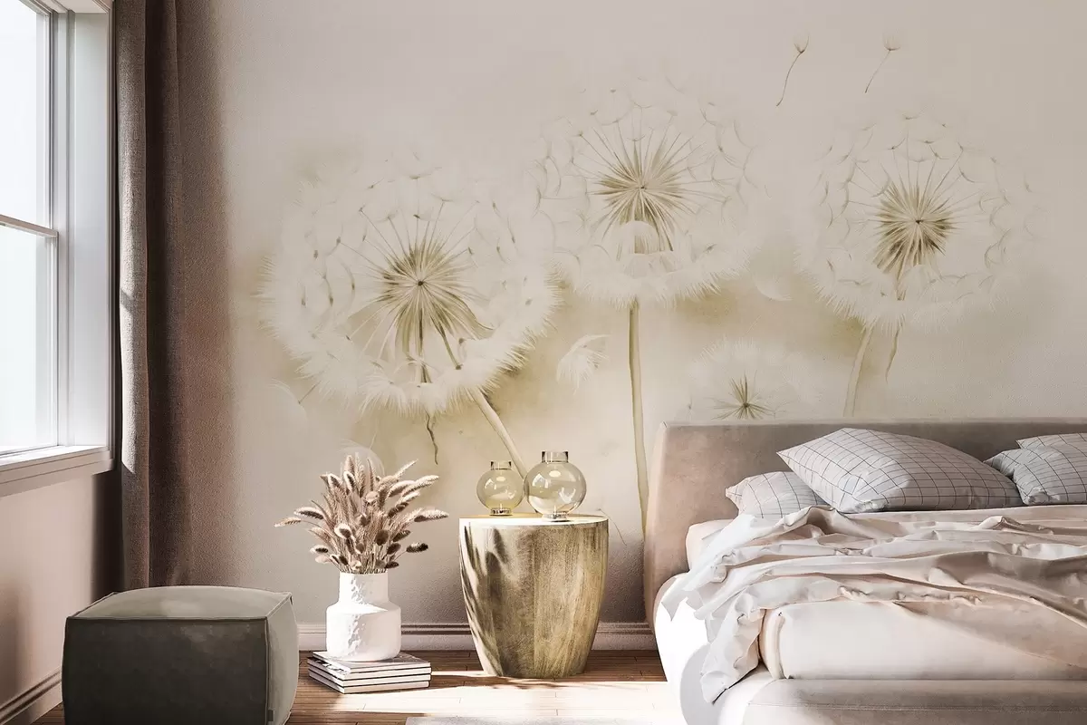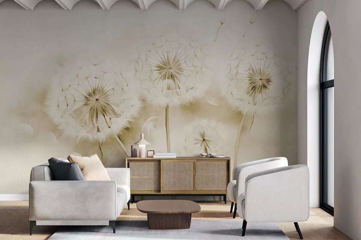 Fototapetai Tekstūruotos pienės su ore sklandančiomis sėklomis, prislopintas geltonas ir baltas fonas, švelnus subtilus piešimo stilius Nr. w09190v1