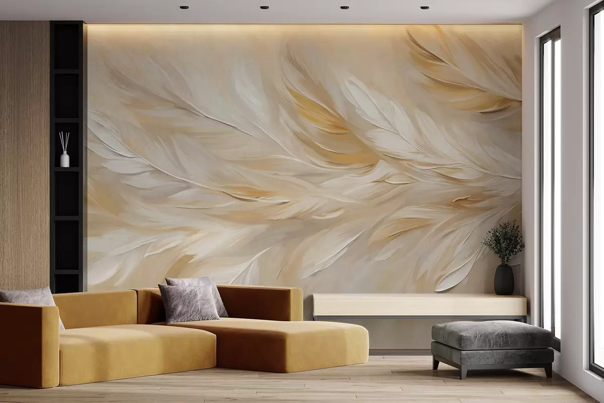 Fototapetai Baltos ir smėlio spalvos plunksnos, sudėtos į tekantį raštą, minkšta tekstūra, šilta spalvų paletė, abstraktus fonas Nr. w09191
