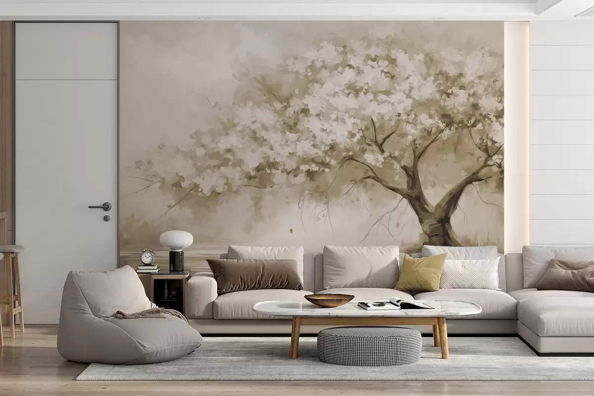 Fototapetai Abstraktus smėlio spalvos žydintis medis šalia upės, švelnios tekstūros potėpiai ir pastelinės spalvos Nr. w09193v1