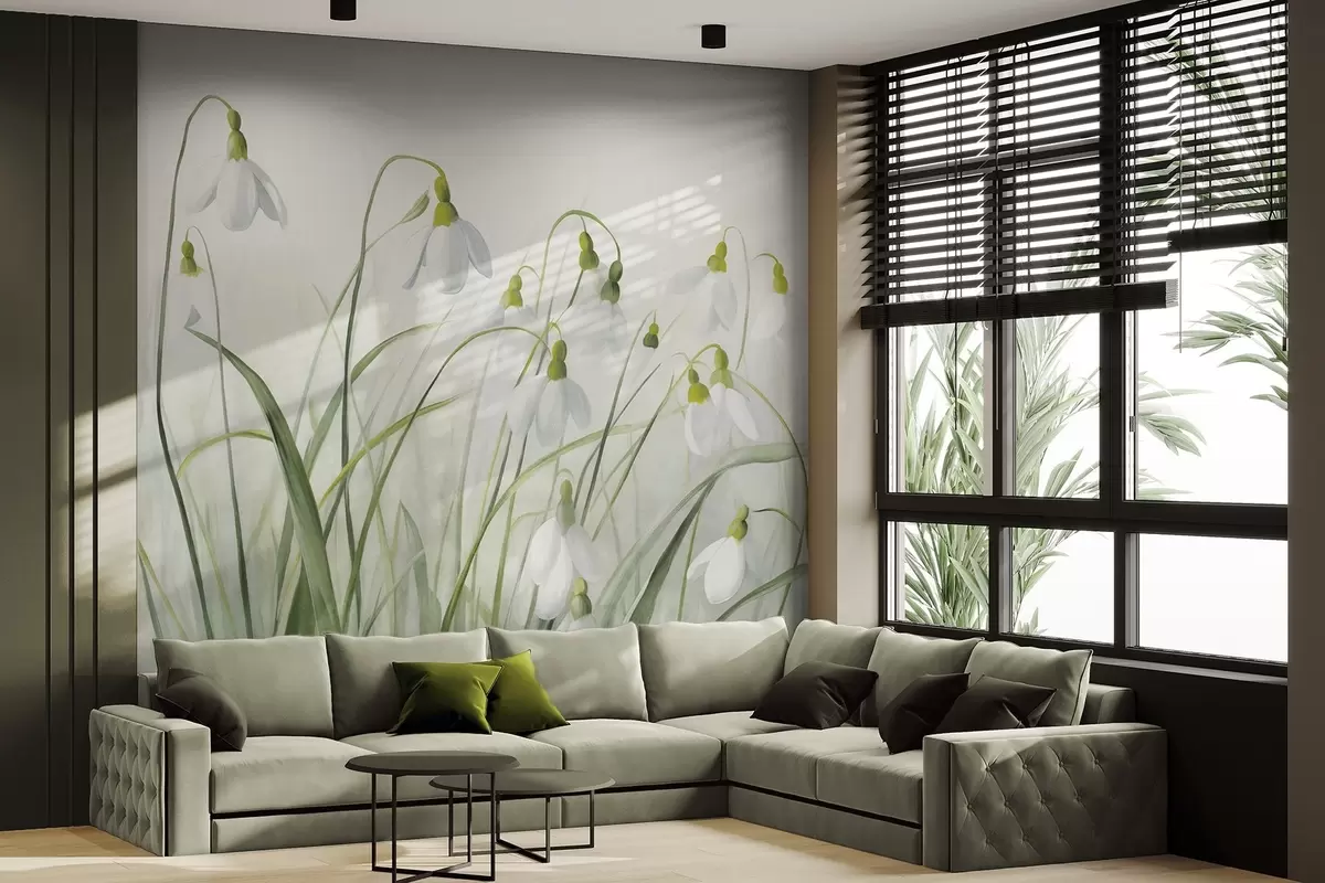 Fototapetai Snieguolės gėlės su žalios tekstūros stiebais ir lapais, akvarelės pavasario stilius, subtilūs potėpiai teptuku Nr. w09195