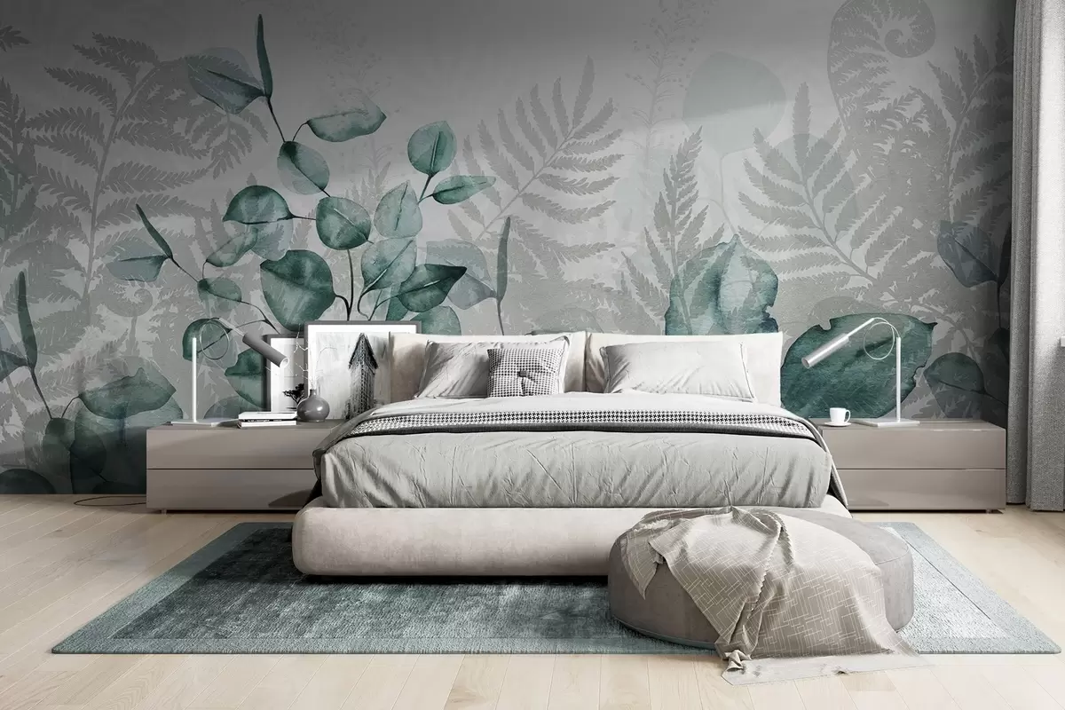 Fototapetai Eukalipto ir paparčio lapai žalios ir pilkos spalvos atspalviais, akvarelės efektas , botaninė iliustracija Nr. w09197