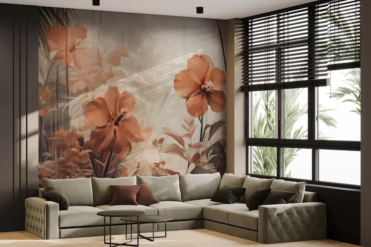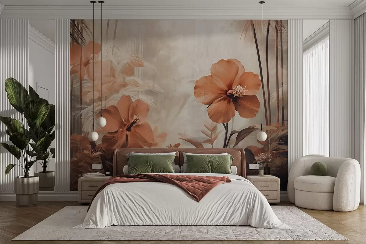Fototapetai Pastelinės raudonos hibiskuso gėlės su lapais ir stiebais, atogrąžų augmenija, švelnios, prislopintos spalvos, vintažinis stilius Nr. w09203
