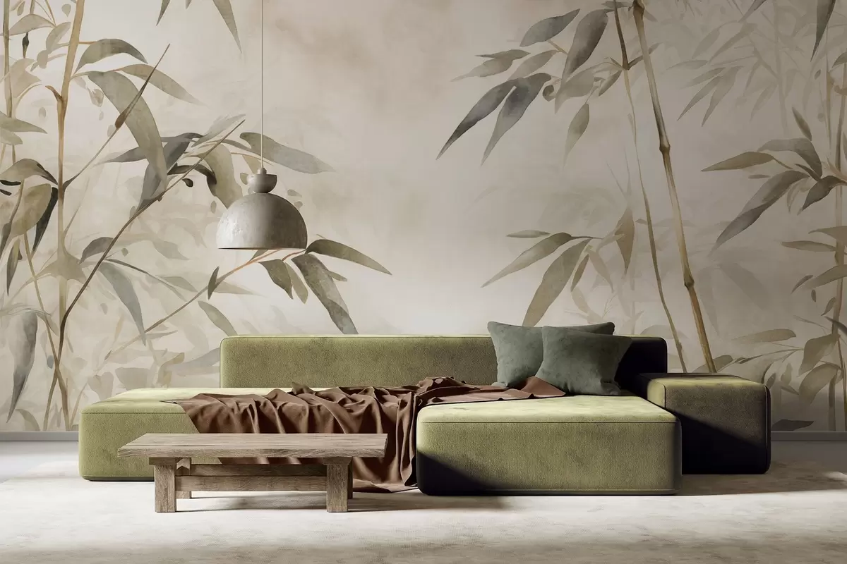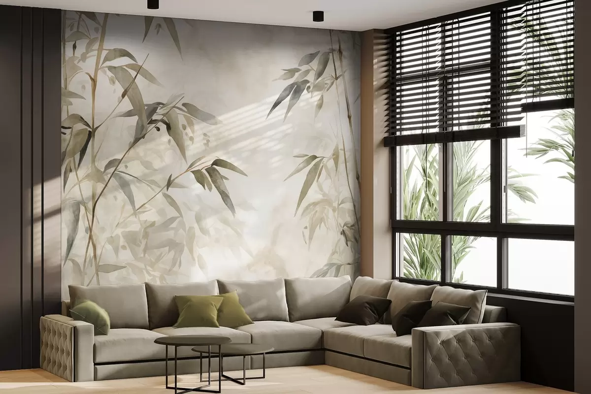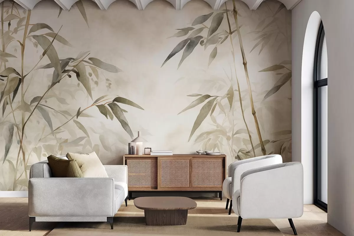 Fototapetai Akvarelės stiliaus bambuko šakos su lapais, minkšta neutrali spalvų paletė, šviesiai smėlio spalvos fonas Nr. w09204