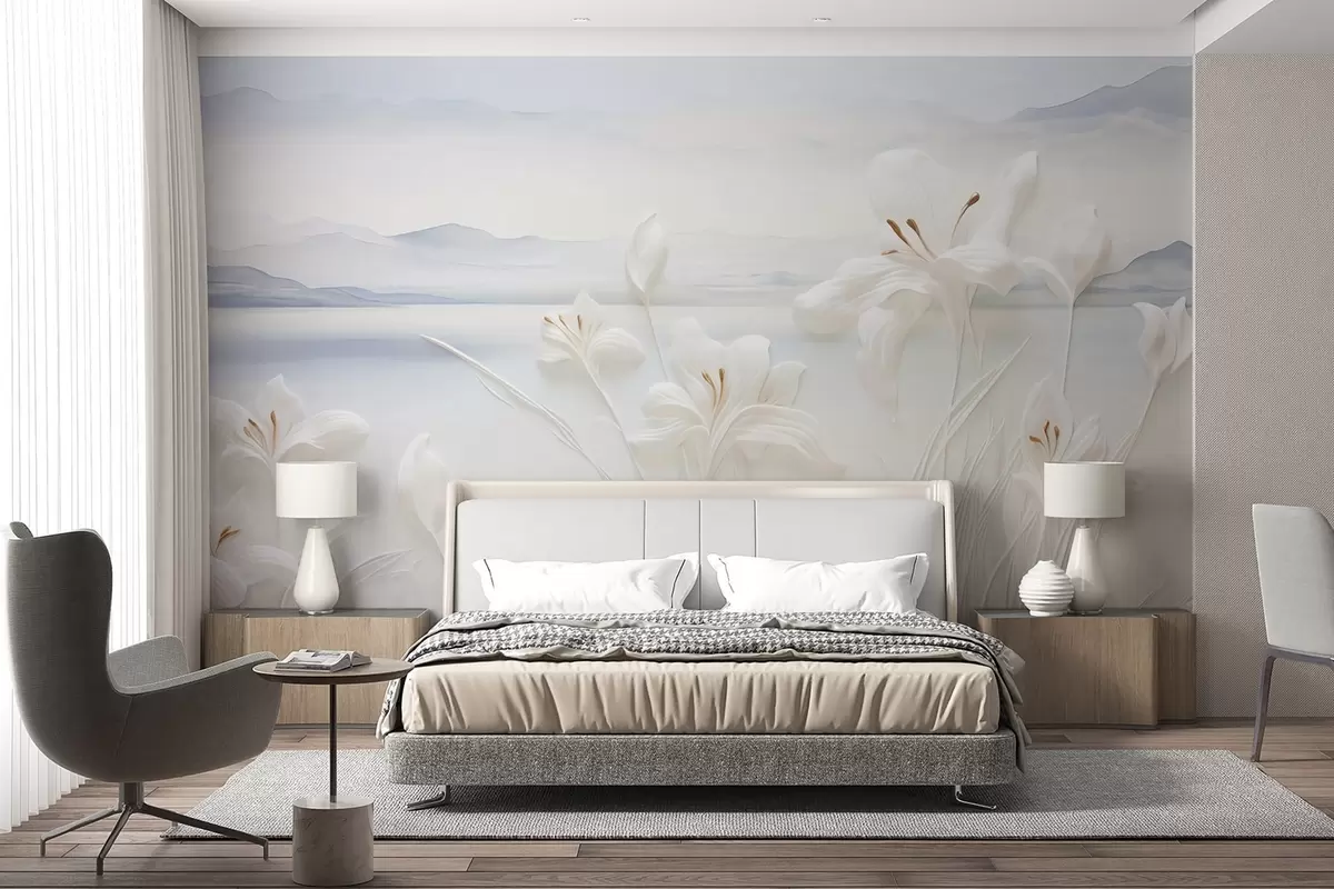 Fototapetai Baltos lelijos ilgais stiebais ir lapais, kalnai ir ežeras fone, minimalistinė kraštovaizdžio kompozicija Nr. w09206