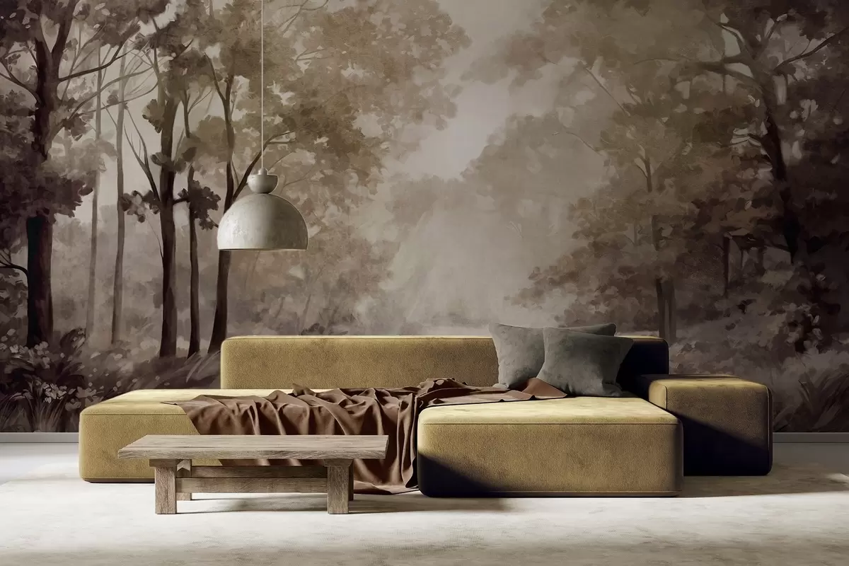 Fototapetai Tekstūruotas miško kraštovaizdis, medžiai su smėlio ir rudais lapais, pastelinių spalvų paletė Nr. w09210